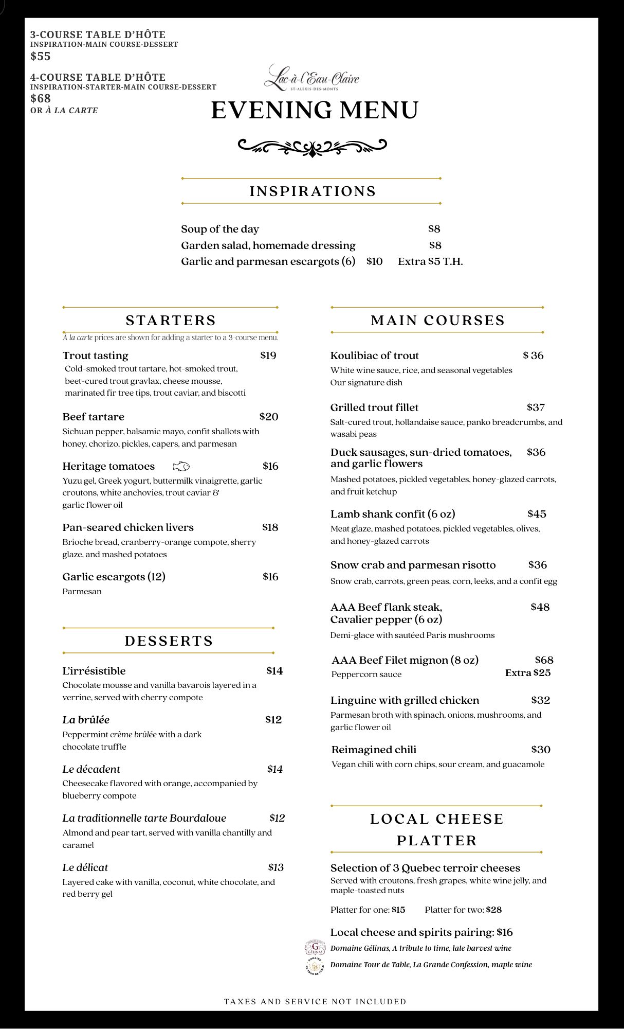 Your taste buds will quickly be delighted by our generous table d’hôte, offering a wide selection of appetizers and desserts, as well as a variety of tempting dishes, including our famous lake trout, always fresh and prepared in a dozen different ways by our Chef. Taste the delights of our gourmet menu!