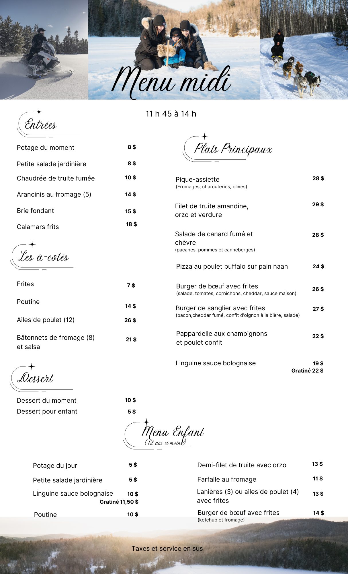 Votre palais sera vite conquis par notre copieuse table d’hôte, qui vous offre un vaste choix d’entrées et de desserts ainsi qu’un grand nombre de plats alléchants, dont notre fameuse truite du lac, toujours fraîche et apprêtée d’une dizaine de façons par notre Chef. Goûter aux délices de notre menu gastronomique!